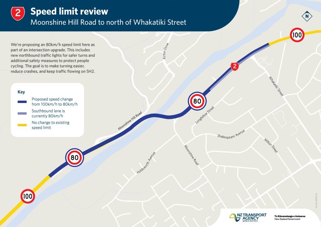 This proposed reduction from 100km/h to 80km/h on SH2, from Moonshine Hill Road to north of Whakatiki St, requires public consultation under the Setting of Speed Limits Rule 2024. We’ll consider safety, technical assessments, cost-benefit analysis, and your feedback before we make a decision.