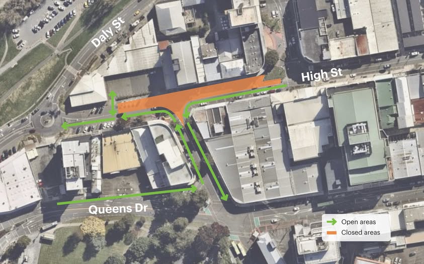 Queens Drive / High Street roundabout: (near McDonald’s) and the left-hand turn from High Street onto Raroa Road remain closed until December 2026 as part of SH2 Melling Transport Improvements