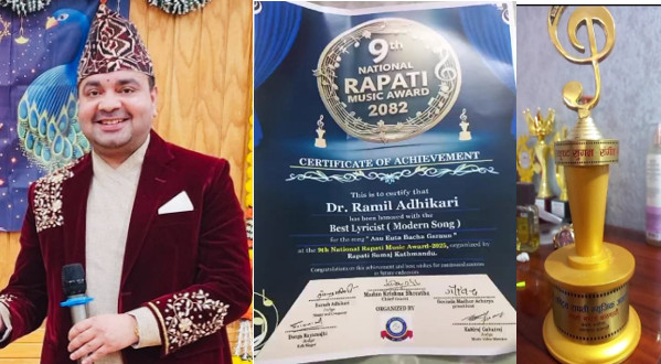 The award was presented at a ceremony held in Kathmandu on Friday, where Dr Adhikari was recognised for his song “Aau Euta Bacha Garau”, which earned him the Best Lyricist title in the Sugam Sangeet genre. The song was also acknowledged multiple times during the programme, highlighting its national impact and popularity.