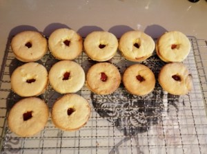 6. When cold, sandwich the biscuits in pairs with raspberry jam. Don’t use too much jam, just enough to stick the biscuits together so it shows through the hole in the top biscuit.