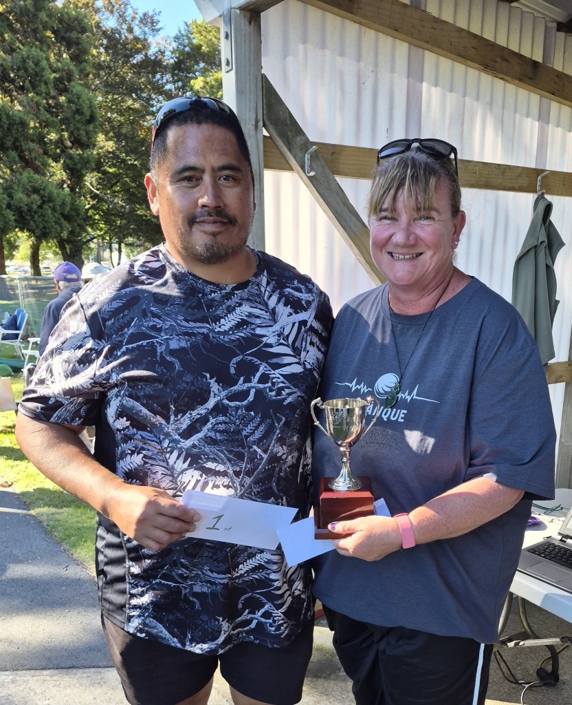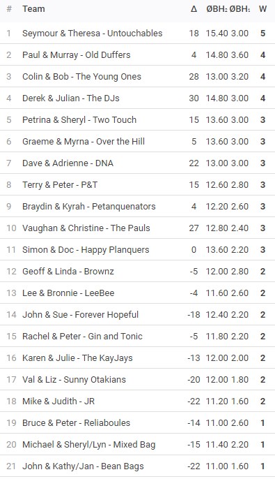 The ranking used after each round of games was based on number of games won first, then by Buchholz 1, then by Buchholz 2 (also known as fine Buchholz), and finally by differential. Most players are familiar with games won and differential, but tournaments such as Swiss are deemed ‘fairer’ using Buchholz because it takes into account the strengths (based on results at the time) of the opposing teams, scaled by the number of games played, thereby more accurately determining the true ranking. The final ranking results attached show that using traditional ranking by only games won and differential, would have had a very different result for 2nd, 3rd and 4th. At the end of the 5 games, the unluckiest team was John, Kathy and Jan (Bean Bags) from Upper Hutt, with 1 win, who took away a couple of goody bags kindly donated by Summeset. Third place was Colin and Bob, (The Young Ones) from Upper Hutt, with 4 wins. Second place was Paul and Murray (Old Duffers) also from Upper Hutt and with 4 wins. In first place was Theresa and Seymour Harawira (Untouchables) with 5 wins, from Silverstream. The top 3 teams all took away generous cash prizes paid from club funds.